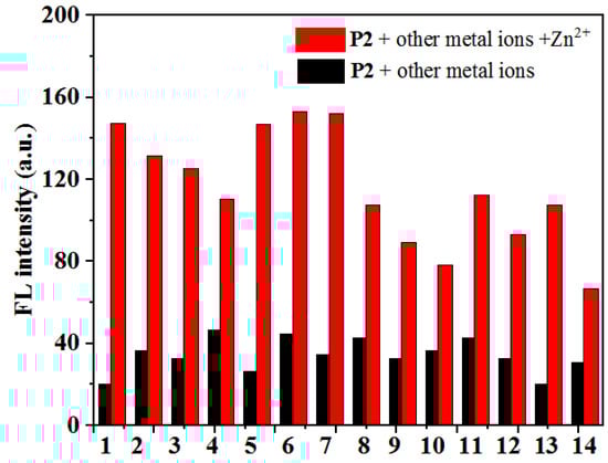 Fluorescence intensity changes of P2 (100 μM) upon the addition of common metal ions (50 μM): 1, none; 2, Cu2+; 3, Mg2+; 4, Al3+; 5, Co2+; 6, Ce4+; 7, Fe3+; 8, Sr2+; 9, Ni2+; 10, Pb2+; 11, Ag+; 12, Eu3+; 13, Pr3+; 14, Gd3+. Black bars: P2 treated with marked metal ions in the absence of Zn2+. Red bars: P2 treated with the marked metal ions, followed by Zn2+ (50 μM).