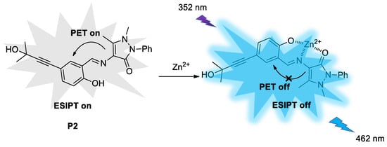 Herein, we designed and synthesized a novel antipyrine derivative P2 that employs the phenolic hydroxyl group within the molecule as a proton donor and the Schiff base structure (-CH=N-) as a proton acceptor. Based on the excited-state intramolecular proton transfer (ESIPT) effect, it achieves precise recognition of zinc ions; meanwhile, the integration of the methyl butynol structure within the molecule extends the conjugated region of the compound, serving as a zinc ion probe with heightened sensitivity.