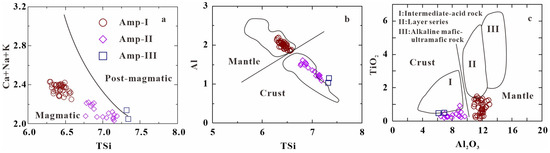 - Molina, J.F.; Scarrow, J.H.; Montero, P.; Bea, F. High-Ti amphibole as a petrogenetic indicator of magma chemistry: Evidence for mildly alkalic-hybrid melts during evolution of Variscan basic–ultrabasic magmatism of Central Iberia. Contrib. Mineral. Petrol. 2009, 158, 69–98. [Google Scholar] [CrossRef]