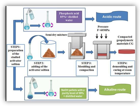According to this elaboration approach, the resulting geopolymers are known as cold-compacted geopolymeric materials, which exhibit attractive properties [6,7]. This type of geopolymer represents a novel development in the field of construction materials, offering a relatively ecofriendly and economical material compared to traditional building materials like earth bricks, Portland cement, and conventionally heated geopolymers [8]. These materials are characterized by several advantages, including higher mechanical strength, robust durability in water immersion, and important dimensional stability [5,6,7]. These benefits encourage further investigation and development of these materials.