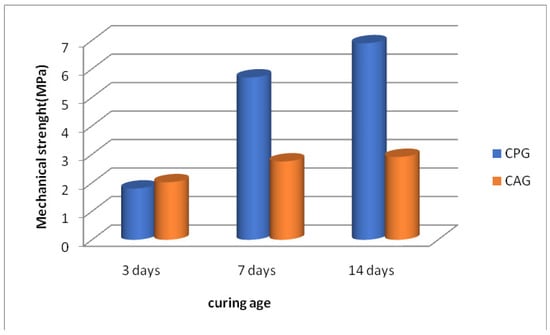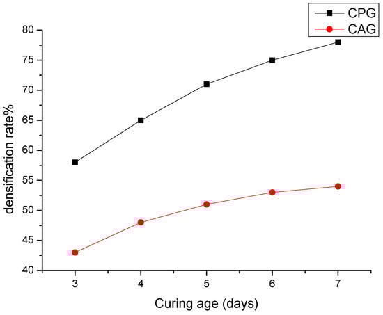Initially, the CPG materials exhibited a densification rate of around 57%, whereas the CAG materials showed a densification rate of approximately 42%, despite both being subjected to the same pressure of 60 MPa. This indicates that the acidic route demonstrated a superior pressing ability, possibly due to its heightened plasticity, which is crucial for subsequent applications, especially in the field of civil engineering. Moreover, this implies that the CPG materials can attain the same densification rate as CAG materials (42%), but with significantly lower pressure requirements, leading to more cost-effective products and decreased energy consumption. This pattern persisted, with CPG achieving a densification rate of 78% after 7 days of curing, while CAG only reached 57%.