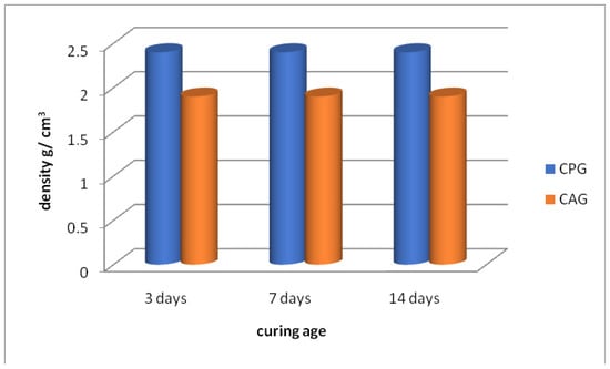 Figure 10 illustrates the evolution of the densification rate for both investigated materials throughout the curing age, specifically from the third to the seventh day of curing, corresponding to the period demonstrating the maximum progress in geopolymerization with the latest techniques. The results underscore a denser microstructure in the case of CPG compared to CAG, irrespective of the curing duration, justifying CPG better mechanical performance and durability, as previously discussed.