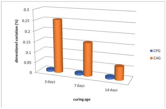 Figure 4 depicts the dimensional variation observed in compacted geopolymeric materials, elaborated through the two investigated routes, over their curing age. The results indicate that compacted phosphate-based geopolymeric (CPG) materials maintained stable dimensions throughout the maturation process (0.05%). Conversely, compacted alkaline-based geopolymeric (CAG) materials exhibited a subtle shrinkage that diminished with the advancing of the curing age, decreasing from 0.25% on day3 to 0.08% on day14. This means that there was a significant shrinkage initially, followed by swelling, ultimately resulting in a minor shrinkage.