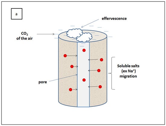 The observed result, particularly in geopolymers obtained through the alkaline route, can be attributed to the efflorescence phenomenon. Efflorescence is commonly associated with the migration of soluble salts toward the surface of porous materials, like concrete or masonry [22,23]. Upon reaction with atmospheric carbon dioxide, these salts can lead to the formation of visible, white, powdery deposits, as depicted in Figure 5. This reaction can be described by the following Equations (1) and (2):