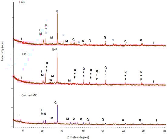 Upon examination of the geopolymeric diffractograms of both CPG and CAG samples, a weak amorphous phase emerged, evidenced by a diffuse halo pattern between 20° and 35° (2θ). This amorphous phase confirmed the geopolymerization phenomenon, highlighting the development of a novel amorphous geopolymeric network irrespective of the activator type.