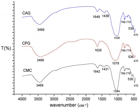 This phenomenon was further corroborated by the pH of the resulting immersion water. Specifically, in the case of the CPG material, no significant pH variation was observed. For instance, if we began with distilled water with a pH of 7 and the obtained pH was 6.12, the pH variation was only 0.88. Conversely, a more significant pH variation was observed in the case of the CAG material. In fact, if we started with distilled water with a pH of 7 and the obtained pH was 9.97, we observed a pH variation of 2.97. This indicates that material dissolution and structural destruction were more pronounced in association with the alkaline route.