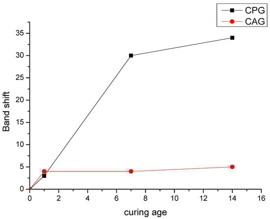 The examination of the literature pertaining to the study of geopolymeric materials, particularly through Fourier transform infrared (FTIR) spectroscopy, revealed a significant insight into the reactivity rates of these materials [20]. The key focus was on the shift in the broad band between 1100 cm−1 and 1000 cm−1 in the FTIR spectrum of geopolymeric materials, serving as a crucial indicator of reactivity. This shift, whether toward higher wavenumbers in the case of acidic activation or lower wavenumbers in the case of alkaline activation, reflected the formation of new geopolymeric structures. The evolution of this FTIR band shift over the curing time of compacted geopolymeric materials activated through both acidic and alkaline routes is presented in Figure 8. Notably, the findings highlight remarkable differences in reactivity rates between the two activation routes. Initially, the alkaline route demonstrated higher reactivity in the early stages of geopolymerization, explaining the superior mechanical performance of CAG compared to CPG at the 3-day mark. However, as the geopolymerization progressed, the acidic route outpaced the alkaline route by becoming seven times faster. Intriguingly, for CAG materials, the geopolymerization phenomenon was achieved within the first 3 days, with a subsequent slow kinetic of formation. In contrast, CPG materials exhibited continuous geopolymerization even after 14 days of curing, with a consistently more significant kinetic compared to the alkaline route. This nuanced understanding underscores the critical role of activation route selection and observation time in influencing the reactivity and kinetics of geopolymerization, thereby impacting the mechanical properties of the resulting materials.