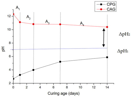 Figure 9 illustrates the pH evolution of the investigated materials throughout the curing age. The results revealed that the rate of pH variation (increase for CPG materials and decrease for CAG materials) was nearly identical for both studied routes only during the initial day of curing, as evidenced by the similar slopes of the curves in area A1. However, subsequently, the CPG material exhibited a more rapid increase in pH compared to the decrease observed in the CAG material, as indicated by the slopes of their respective curves in other areas (A2, A3, and A4).