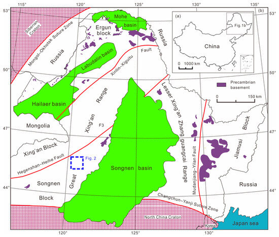 - Tang, Z.-Y.; Li, J.; Li, Q.-Y.; Sun, D.-Y.; Gou, J.; Deng, C.-Z. Spatio-and temporal patterns of Jurassic–Early Cretaceous volcanism in the Great Xing’an range, NE China: Constraints on the geodynamic evolution. Int. Geol. Rev. 2023, 65, 1977–1998. [Google Scholar] [CrossRef]