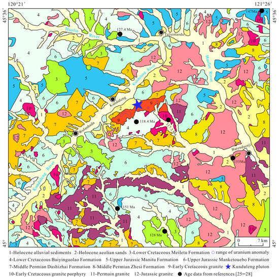 The NE-trending Duribuleji-Wulanhada fault identified along the Kunduleng River [37] and the NW-EW trending fault observed along the Huolinhe River controlled the volcanic eruptions, the emplacement of granite plutons, and the occurrence of uranium anomalies in the region. The uranium anomalous granite under investigation is located approximately 6 km southeast of the Kunduleng town in Inner Mongolia, China. The Kunduleng pluton is relatively diminutive in comparison to numerous other plutons, with dimensions of approximately 14 km along its longest axis (NE-SW), 3 km along its shortest axis (NW-SE) and covering an area of about 42 km2. The granite intruded into the intermediate to acid volcanic rocks of the Early Permian Dashizhai Formation and the rhyolitic pyroclastic rocks of the Late Jurassic Manketouebo Formation. Subsequently, it was overlain by the rhyolitic lava flows and welded tuffs of the Early Cretaceous Baiyingaolao Formation (Figure 2).