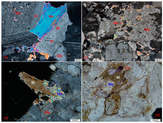 No faults have been observed within the Kunduleng pluton, with jointing being the predominant structural feature. Three intersecting joint sets are present: a northwest trend, a northeast trend, and a horizontal trend (Figure 3a). There are four locations of high radioactive anomalies within the Kunduleng pluton. The anomalous area is about 3 km2 in total, accounting for 7% of the surface exposure of the granite pluton. Detailed examination of the identified uranium anomalies found they were confined to the area characterized by well-developed joints. In the vicinity of joints, these granites frequently undergo varying degrees of hydrothermal alteration (Figure 3b), leading to the formation of reddish altered rocks containing elevated concentrations of radiogenic elements. Sericitization of plagioclase is extensively developed in the radiometrically anomalous granites (Figure 4a). The K-feldspar appears to be relatively fresh, yet it also shows signs of clayization. Secondary muscovite replacing K-feldspar also occurred locally (Figure 4b). Biotite is partially converted to muscovite (Figure 4c) and there is rare fluorite observed in the altered biotite (Figure 4d).