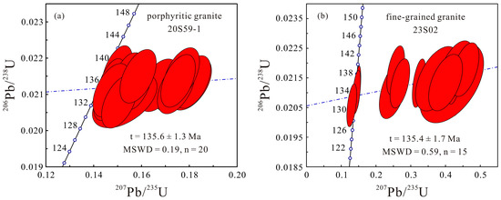 Twenty zircon grains from sample 20S59-1 (porphyritic granite) were analyzed. All analyses form a tight cluster with a weighted mean 206Pb/238U age of 135.6 ± 1.3 Ma (Figure 6a), which is interpreted as the crystallization age of the porphyritic granite. Fifteen analyses were performed on 15 individual zircon grains extracted from sample 23S02 (fine-grained granite). The results yielded 206Pb/238U ages ranging from 131 ± 3 to 139 ± 4 Ma (Table 1). The weighted mean 206Pb/238U age was determined to be 135.4 ± 1.7 Ma (Figure 6b), interpreted as the time of emplacement and crystallization of the fine-grained granite.