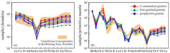 REE patterns (a) and trace element spider diagrams (b) for the Kunduleng granites. Values for normalization are sourced from references [53,54]. The uraniferous leucogranites are sourced from reference [55].