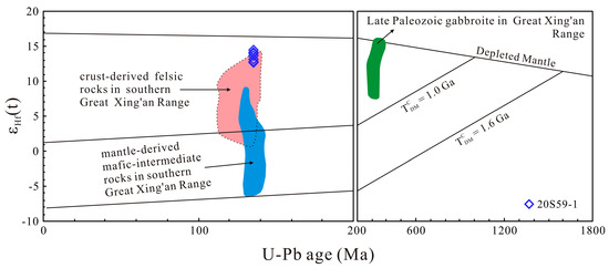 Zircon εHf(t) versus age diagram for the Kunduleng granite. The U–Pb ages and Hf isotopic composition of zircon in magmatic rocks from the Great Xing’an Range are sourced from references [56,57,58,59,60,61,62,63,64,65,66,67].