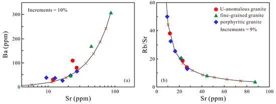 (a) Ba vs. Sr and (b) K/Rb vs. Sr diagrams of the Kunduleng granites. For modeling Rayleigh fractionation, the FC–AFC–FCA and mixing modeler developed by Ersoy and Helvacı (2010) [68] is employed.