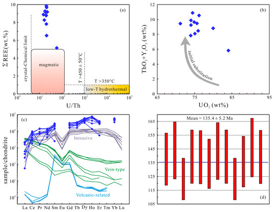 (a) Total REE content (wt%) versus U/Th diagram of uraninite (after [73,74]); (b) ThO2 + Y2O3 versus UO2 (wt%) diagram of uraninite (after [70]); (c) chondrite-normalized rare earth element patterns for uraninite from the Kunduleng granite. The data for uraninite in intrusive, vein-type, and volcanic-related deposits are from reference [75]. The values utilized for normalization come from the reference [76]. (d) Weighted mean U–Th–Pb EPMA chemical ages of uraninite.