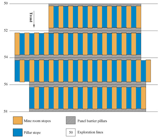 The main ore body of Dongguashan is divided into several panels along the strike direction, with a span of 100 m for each panel. It is vital to leave isolated pillars between each pan area to achieve independent mining for each pan area in this mining method. Within each panel, the 18 m wide area is taken as the stopes along the vertical ore body trend in turn, and the room-stopes and the pillar-stopes are arranged alternately. The first four panels (50–58 lines) were identified, as shown in Figure 4.