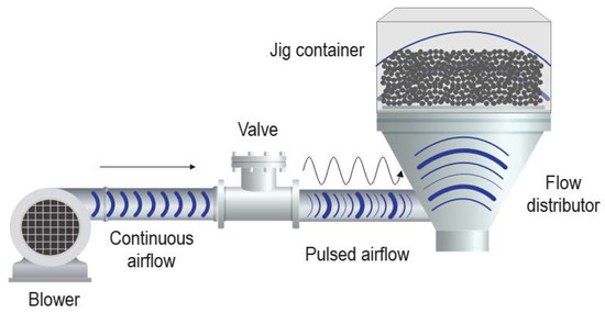 - Aziz, M.A.; Isa, K.M.; Miles, N.; Rashid, R. Pneumatic jig: Effect of airflow, time and pulse rates on solid particle separation. Int. J. Environ. Sci. Technol. 2019, 16, 11–22. [Google Scholar] [CrossRef]