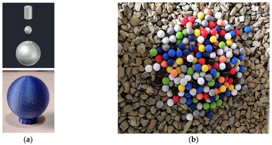 The density tracers used were made of polylactic acid (PLA) and produced using the fused deposition modeling (FDM) 3D printing method, as described by Warke and Puranik [32]. The tracers were spherical, with a diameter of 20 mm, and had the following specific masses: 0.4, 0.6, 0.8, 1.0, 1.2, 1.4, 1.6, 1.8, 2.0, 2.2, and 2.4 g/cm3. During manufacturing, the density of the tracers was adjusted by the thickness of the internal cavity for densities below 1.2 g/cm3 whereas, for densities above 1.2 g/cm3, it was also necessary to set the diameter of steel microspheres introduced into the internal cavity (Figure 4a) to ensure the desired density range and facilitate the magnetic recovery of the tracers (Table 1). This adjustment requirement limited the minimum diameter of the tracers to the adopted value of 20 mm. Each of the 11 specific masses comprised 20 spheres of different colors and embossed marking indicating the nominal density, totaling 220 density tracers (Figure 4b).