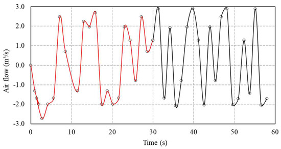 Figure 5 depicts the variation in airflow (calculated as described in Section 2.1) over time for a fixed pulsation of 85 CPM (1.4 cycles per second) and a peak flow of 2.9 m3/s. It is evident that it takes approximately 30 s for the ∆P signal to stabilize. A ‘stable signal’ is defined to mean the repetition of peaks and valleys and the shape (signature) of the airflow profile over time. It can be observed that the pulse, represented by the red line, takes about 30 s to reach a steady flow rate and pulse frequency, as indicated by the black line. This implies that tests conducted in periods shorter than 30 s would not accurately represent the jigging conditions defined in the equipment control panel.