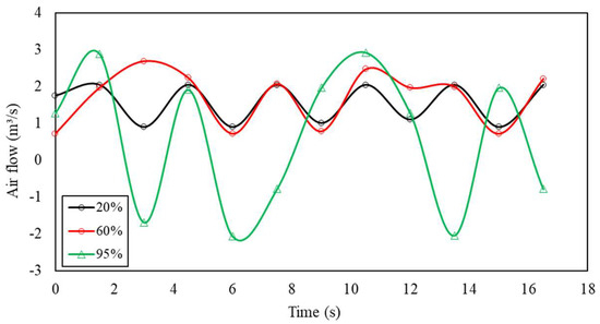 To examine whether the observed pattern persisted across various pulsation conditions, we compared airflow curves for different blower power used, as depicted in Figure 6. Notably, at lower airflow rates (20% blower power), the curve displayed a well-defined and harmonious pattern over time, characterized by distinct yet similar peaks and valleys. Additionally, it exhibited a consistent wave period and frequency of 3 s and 0.33 Hz (≈20 CPM, closely aligned with the value specified in the control panel), respectively. However, at significantly higher airflow rates (60% and 95% blower power), the airflow profile becomes erratic, displaying peaks and valleys of varying magnitudes, including notably negative ones. The wave period and frequency also fluctuate and do not align with the rotation of the butterfly valve displayed by the jig panel.