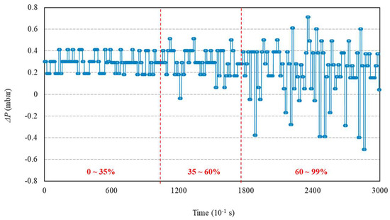 Evaluating the variations in ∆P across the entire spectrum of jig airflow rates, as shown in Figure 7, can be a way to assess the significance of the second hypothesis. It is noted that the ∆P signal showed three distinct phases: