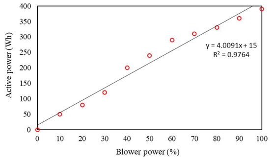 Figure 8 shows the relationship between the blower airflow and the power used. There is a nearly linear increase in energy consumption as the blower flow rate increases, with peak consumption reaching around 400 Wh. It is important to note that this curve only considers the power associated with the air blower. For the operation of the rotary valve of the jig, the average useful power demanded across the entire operational range (10 to 400 CPM) is 54.74 ± 5.41 Wh. The slight variation in consumption with rotation is because most of the power is used to drive the valve. The dust collection system, particularly the fan generating suction in the duct, showed a fixed consumption of 40 Wh.