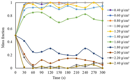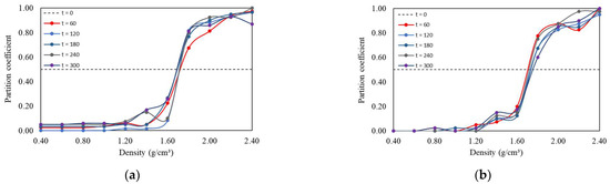 Jigging tests were conducted under the conditions described in Section 2.4 for jigging times of 30, 60, 90, 120, 150, 180, 210, 240, 270, and 300 s. The pulsation conditions were kept constant at 70 CPM, with an airflow peak of 2.9 m3/s (corresponding to 95% of the maximum fan flow rate). Figure 9 and Table 3 show the joint partition curves and the resulting separation efficiency indices, respectively.