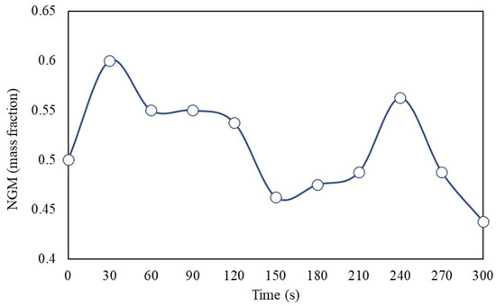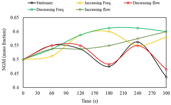 Finally, in Figure 19, the variation profiles of the mean percentage experimental error (MPE) for all the test conditions are compared. It can be observed that the conventional stationary condition has the highest MPE magnitude, while all transient pulse conditions, especially the decreasing frequency pulses and increasing flow pulses, exhibited lower MPE magnitudes (the errors remained below 8% within the NGM range). As discussed earlier, this is possibly due to greater stabilization in the concentration of the NGM fraction when using transient pulses, resulting in a lower experimental error for this operational condition.