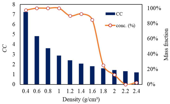 where , , and are the densities of the dense material, light material, and fluid, respectively. The quotient q is related to the flow regime, where q = ½ for the Stoke’s regime, q = 1 for the Newtons’ regime, and ½ < q < 1 for the intermediary regime [13]. For example, considering the separation of coarse coal (ρs = 1.3 g/cm3) and quartz (ρs = 2.6 g/cm3), the values of CC in water and air would be 5.33 and 2, respectively (Newtonian regime), indicating a significantly greater separation difficulty in the latter case.
