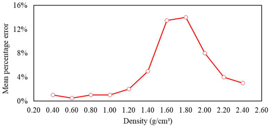As indicated in Section 2.3, all tests were performed in duplicate in order to estimate the experimental deviation of the data as well as to verify how this varied for each tracer and each jigging time. In Figure 13, the average percentage error (calculated using Equation (7) for each tracer across all jigging times is displayed. It is evident that the error stayed below 5% for tracers with the lowest (1.40 g/cm3 or less) and highest (2.20 g/cm3 or more) densities. However, there is a peak of around 14% between densities of 1.60 and 1.80 g/cm3, which matches the and NGM range measured in the tests. Since this density range is expected to be more challenging to separate, it is reasonable to infer that the higher difference between the duplicate measurements for tracers in the NGM range is linked to a greater occurrence of short circuits (cross-contamination between light and dense zones).