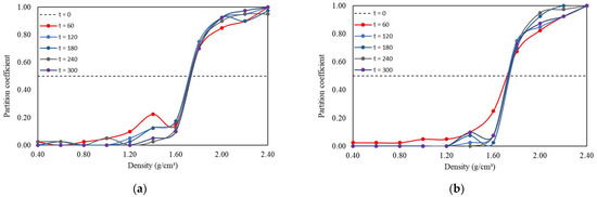 Figure 16 and Table 5 depict partition curves and their respective indices for tests with transient flow pulses of increasing flow and decreasing frequency (case 2 previously mentioned). Despite the short circuits indicated at the curve limits (also observed in other operational conditions, suggesting contamination of light and dense products), it is noteworthy to observe the overlap of different partition curves within the – interval, particularly for the transient flow pulse condition with increasing flow. This overlap indicates stability, as it suggests that the slope of the partition curve was not significantly affected by jigging time except in the initial moments (highlighted in the decreasing frequency curve in Figure 16b). Another way to assess this behavior is through the variability of the value. For decreasing frequency and increasing flow pulses, the mean values and standard deviations of were 1.73 g/cm3 (±1.08%) and 1.72 g/cm3 (±0.46%), respectively. The low standard deviations around the mean indicate minimal fluctuation in values, implying high stability of the separation density, practically independent of jigging time (for t > 60 s).