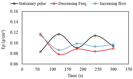 Figure 14 and Table 4 display the partition curves and their respective indices for the tests with transient flow pulse of decreasing flow rate and increasing frequency (case 1 mentioned above). In general, concerning separation efficiency alone, no significant differences were observed between the partitions under fixed pulsation and under the considered transient pulsation conditions. However, there were some nuanced differences. The average separation density for decreasing flow rate remained at = 1.71 g/cm3, but with a more consistent level of regularity (standard deviation of only 0.88% compared to 1.71% for the steady-state case). For the increasing frequency condition, the separation density was slightly higher, at 1.73 g/cm3 (±1.08%). On the other hand, while the partition indices showed similar values, again oscillating close to Ep ≈ 0.1, their variation over time demonstrated greater inconsistency (Figure 15). In other words, the stratification became more unstable, making it harder to predict partitioning over time. The approximate oscillation period (between peaks and troughs) remained at 60 s.