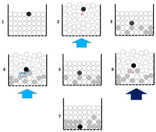 Based on the above, a preliminary possible mechanism is proposed to describe the effect of transient pulses on the stratification of the dry jigging bed. The key to this mechanism lies in the variation in the bed porosity throughout the jigging cycle and the subsequent mobility of particles with different densities while the bed is open. Figure 20 depicts a hypothetical situation representing a jigging bed immediately before the start of the pulse. The numbering from 1 to 7 represents the sequence of events presumed to occur during the variation in the pulse magnitude passing through the bed (in the case of pulses with increasing flow, for example), considering the possible movement of a dense particle. In this case, the following sequence can occur: