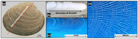Bivalve shells, such as the butter clam, have growth rings that are much like trees, with the relevant layering visible on length scales that are appropriate for optical imaging (tens to hundreds of micrometres) [15]. Figure 1 shows representative views of a half-shell (valve) of the butter clam over different length scales (Zeiss Axiozoom (Oberkochen, Germany) under reflected light, with image enhancement using Adobe Photoshop (version 23, San Jose, CA, USA). The top view of an entire valve (Figure 1a) shows a ridged surface topography, with the axis of maximum growth indicated with a red line. A cross-sectional view along this midline (Figure 1b) shows the growth rings as grey lines. Staining with Mutvei’s solution [17] (Figure 1c,d) makes the growth layers easier to see because of the increased visual contrast between the mineral (lower uptake of the stain) and organic-rich layers in between (higher uptake of stain). The outer proteinaceous layer on the outer surface of the shell (periostracum) also has higher stain uptake.