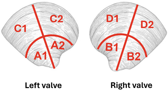 Schematic depiction of the sectioning and labels for different clam portions: A1, A2, B1, and B2 are hinges, while C1, C2, D1, and D2 are non-hinge portions. Adapted from a public domain image [22].