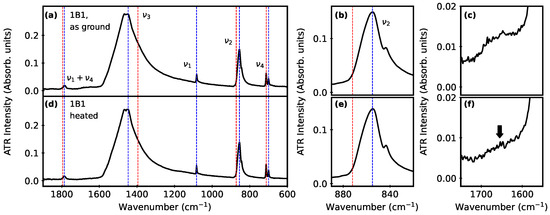 Representative ATR−FTIR spectra for butter clam powder before (a–c) and after (d–f) heating. Blue and red vertical lines show peak positions for standards of aragonite (RRUFFID R040078) and calcite (RRUFFID R040070), respectively [27]. Plots (b,e) focus on the region; plots (c,f) highlight the region where weak protein-based amide and water peaks disappear after heating (1600–1700 cm−1). The black arrow (f) highlights the reduction of the protein hump peak intensity after heating.