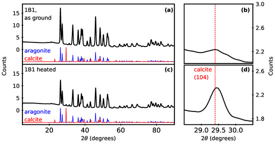 Representative PXRD data of butter clam powder (black lines) before (a) and after (c) heating. The blue and red patterns show data for standards of aragonite (PDF 980000098) and calcite (PDF 980000141), respectively [26]. Plots (b,d) show an intensity increase for the strongest calcite line (104) after heating; the dotted red vertical line shows the peak position for the calcite standard pattern.