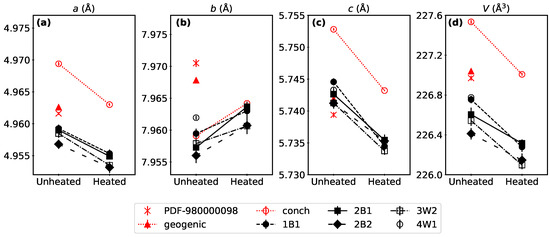A comparison of aragonite cell parameters (in Å) (panels (a–c)) and V (volume in Å3) (panel (d)), for different clam samples before and after heating (where possible), all shown with black symbols. Red symbols show comparisons to an aragonite standard (PDF# 980000098 [26]) and aragonite parameters reported by others (geogenic and conch from [31,32,33]).