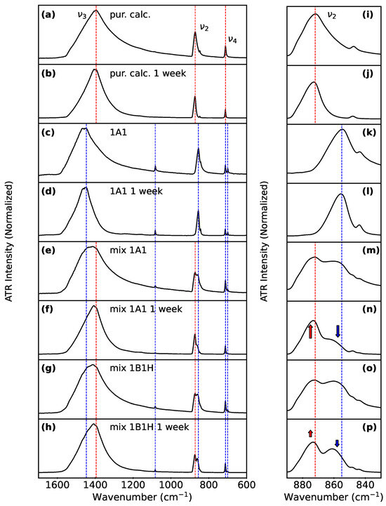 In order to track polymorphic phase conversion, we compared the ATR-FTIR spectra of powders before and after they were stirred in water (ultrapure, 18.2 Mcm) for 1 week. A detailed comparison of representative spectra is shown in Figure 6, including a single powder alone (Figure 6a–d,i–l) or mixtures of clam powder with purchased calcite (Figure 6e–h,m–p). Additional spectra are provided in Supplementary Materials Figures S7 and S9.