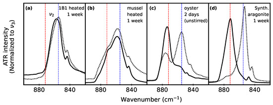 For biogenic specimens that already contain mixed polymorphs, the mere co-existence of calcite and aragonite does not guarantee that the polymorphic pumping behaviour is noticeable. Figure 7 helps to illustrate this point. Figure 7a compares ATR-FTIR spectra for heated butter clam powder before and after 1 week of stirring in water. There was no evidence of polymorphic pumping, similar to what is shown in Figure 6c,d,k,l for a different (unheated) clam portion. In both cases, the clam spectra show only aragonite after being stirred in water for one week.