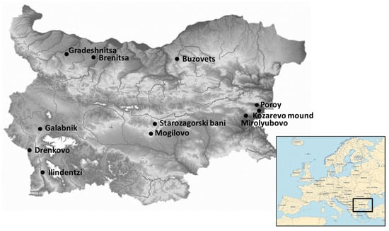 Map of Bulgaria with archaeological sites where the fragments were collected.