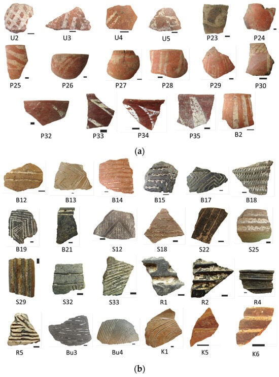 Photographs of the analyzed (a) painted and (b) inlaid pottery fragments with the corresponding sample IDs. The scale markers in the photos represent 1 cm.