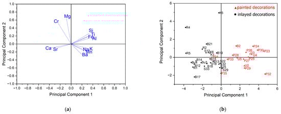 The PCA score plot demonstrates the apparent separation between the painted sherds and inlaid sherds, mainly along the direction of PC 1 (Figure 3b). Most of the painted sherds are clustered in the positive part of PC 1, and the inlaid sherds in the negative part. It can be seen that the inlaid sherds are characterized by an increased content of calcium and strontium compared to the painted sherds. Hence, it can be deduced that the prime constituent in the inlaid decorations is Cal.