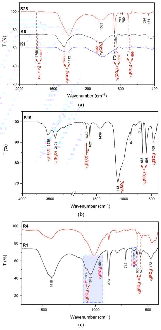 Representative FTIR spectra of selected samples: (a) IR spectra of samples S25, K6, and K1 show the assigned characteristic peaks of Cal, Arg, and a mixture of both within the 2000−400 cm−1 spectral range. The peaks denoted in black refer to Cal, and the peaks in red refer to Arg; (b) The IR spectrum of sample B19 shows the assigned characteristic peaks of Gp within the 4000−400 cm−1 spectral range; (c) IR spectra of samples R1 and R4, revealing the presence of Hap (the red labels) within the 1700−400 cm−1 spectral range. The characteristic peaks of the phosphate (PO43−) and hydroxyl (OH−) groups, highlighted in the blue rectangles of the R1 spectrum, are missing from the R4 spectrum, which infers a significant presence of magnesium.