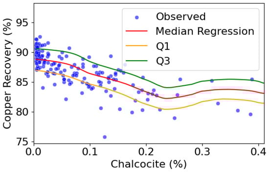 This research evaluates the performance of the conditional quantile regression method (CQRM) compared to the classical geostatistical collocated cokriging method (CCM) for modeling copper metallurgical recovery based on a predominantly measured geological attribute.