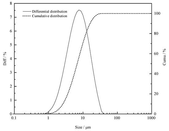 The high-quality raw muscovite sample used in this study was obtained from Henan Province, China. The X-ray Fluorescence analysis results of raw ore listed in Table 1 indicate that the purity (93.25%) of the sample meets the requirement of pure mineral flotation. Pure muscovite samples were ground in a ceramic-lined ball mill for 1.5 h and then classified using wet sieving, settled, and dried. Finally, the mineral sample (D90 = 17.38 μm) used for micro-flotation was obtained. The particle size characteristic curve of the sample is shown in Figure 1.
