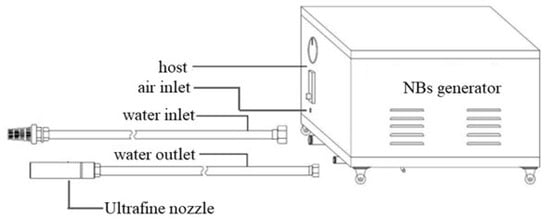 The experiment involved using nanobubble water, generated from a nanobubble generator purchased from Yunnan Xiazhichun Company in Kunming, Yunnan province, China. The generator comprises an inlet and outlet, barometer, and box and utilizes a combination of mechanical stirring and ultrasonic cavitation to thoroughly mix the gas and liquid phases [25]. This ultimately results in the production of an aqueous solution that is rich in nanobubbles, with sizes ranging from 200 nm to 4 μm. A detailed schematic diagram of the nanobubble-generating device is provided in Figure 2, which highlights the specific components and their functions in the process.