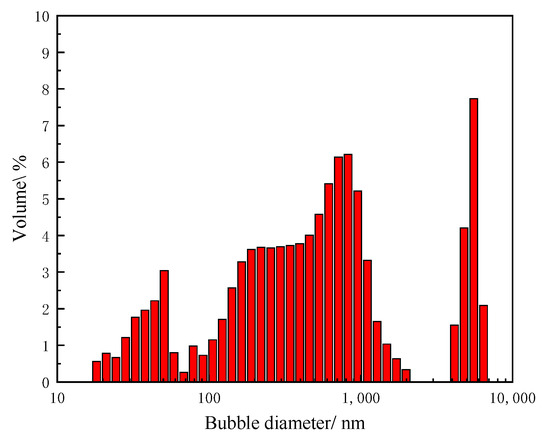 To generate nanobubble water, ultra-pure water should be injected into the water inlet pipe with a filter hood until the water tank is filled, and the water outlet pipe with an ultra-pure water nozzle is discharged [26]. Afterward, the water inlet pipe should be inserted into the bucket with ultra-pure water, and the power supply should be switched on to start the nanobubbles generator. During operation, the ultra-pure water is drawn through the water inlet pipe, while air is sucked into the machine through the air inlet. The airflow is monitored using the flow meter control connected to the air intake. Nanobubble water is then ejected using the ultra-micro nozzle and collected with a clean beaker. The newly collected nanobubble water has a milky-white appearance. To ensure the stability of the nanobubble aqueous solution, all nanobubble aqueous solutions should be readily available. Finally, the prepared nanobubble aqueous solution can be analyzed using Zeta sizer Nano ZS 90 to determine the bubble particle size distribution in the solution, as shown in Figure 3. The Zeta sizer Nano ZS 90 was purchased from Malvern Panalytical in Shanghai, China.