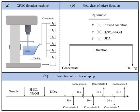 Figure 4. (a) XFGC hanging trough flotation machine (Jilin Prospecting Machinery Factory); (b) Flow chart of micro-flotation; (c) Flow chart of batches scraping.